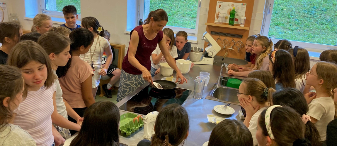 Von Donnerstag auf Freitag übernachteten die Erstklässler*innen, die die Unverbindliche Übung „Französisch Atelier“ besucht hatten, zum Abschluss in der Schule. Nach einem Pétanque-Turnier mit einem spannenden Finale ging es ans Crêpes-Backen in der Schulküche. Dabei gelang es sogar manchen, die Crêpes mittels Wurftechnik zu wenden (siehe Videos). Anschließend bezogen die 34 Mädels und Burschen den Turnsaal 1 und richteten sich gemütlich ein, bevor sie sich zum Abschluss des Abends den Film „Ratatouille“ ansahen. Nach einer eher kurzen Nacht gab es noch ein gemeinsames Frühstück.